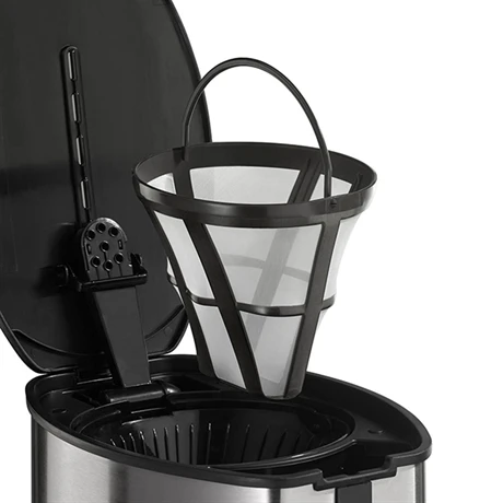 Facile d’entretien, elle dispose d’un vernis de protection sur l’inox pour éviter les traces de doigts et conserver une machine comme neuve tout au long de son utilisation. Astucieuse, elle dispose d’un porte-filtre pouvant accueillir le filtre permanent en nylon fourni mais aussi des filtres en papier.