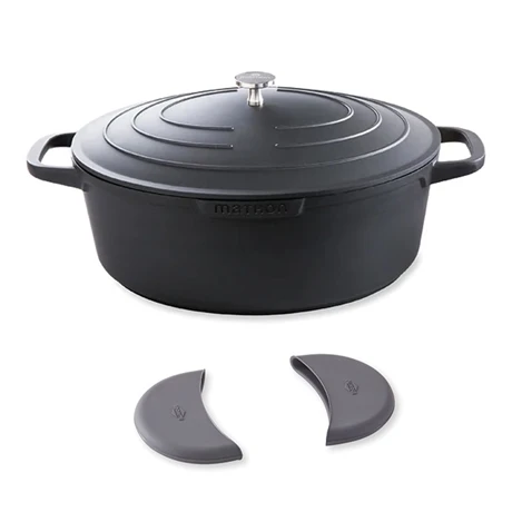 Lot Cocotte Légère Ovale En Fonte D’aluminium 32 Cm Coloris Noir Et Deux Maniques Silicone