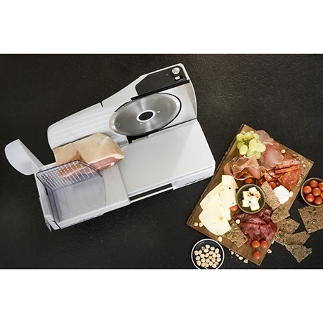 Cette trancheuse électrique possède une lame crantée de 19 cm en acier inox, idéale pour couper et trancher avec précision de nombreux aliments : charcuterie, fromages, légumes, pain… Pratique et efficace, elle s’utilise quotidiennement. Son chariot de belle dimension offre une longueur de coupe de 20 cm. Précise, elle se règle suivant l’épaisseur de coupe souhaitée de 0 à 2,8 cm. Cette trancheuse est très pratique pour réaliser des chiffonades de jambon ou des tranches de fromage à raclette !