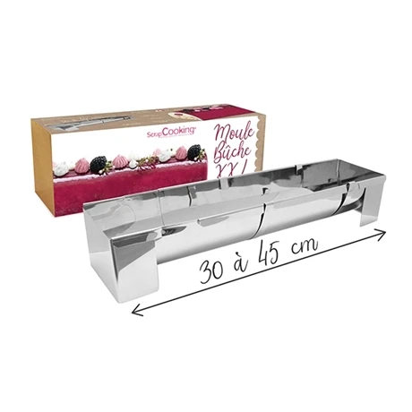 Pâtissez des bûches et entremets de grande taille grâce à notre moule à bûche en inox XXL. Ajustable, il peut être rétracté ou étendu de 30 à 42 cm en longueur : avec un seul moule, vous pourrez faire toutes vos bûches, qu’elles soient de taille normale ou grande. En acier inoxydable, le moule résistera aux écarts de température, pour conserver vos bûches au congélateur ou passer vos préparations au four. Les pieds qui l’accompagnent sont composés de la même matière et garantiront sa stabilité et un niveau parfaitement plat, et cet ensemble en inox permet de passer votre moule à bûche au lave-vaisselle.